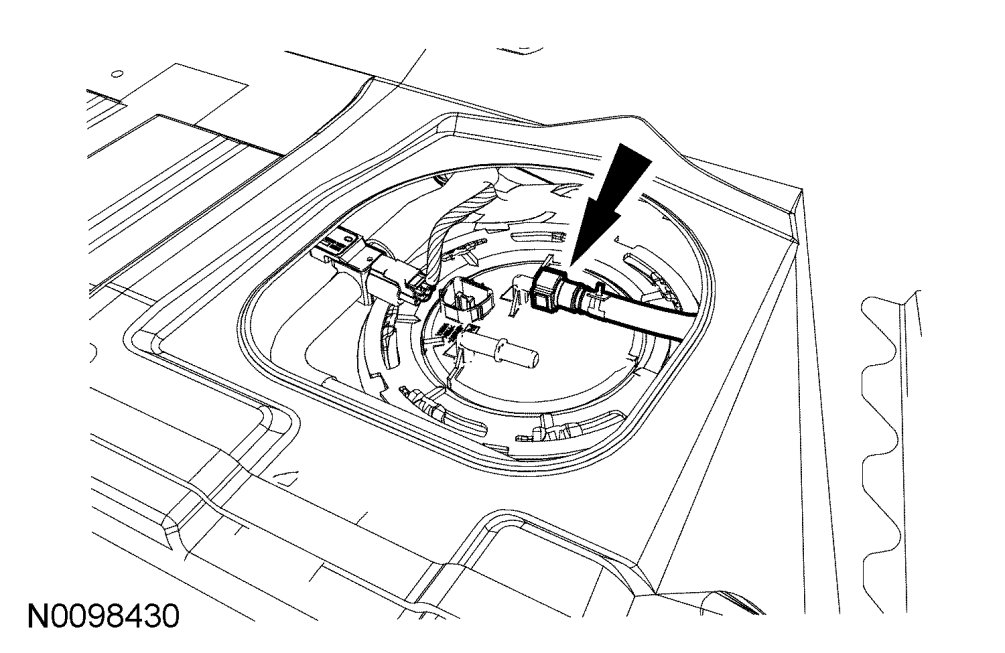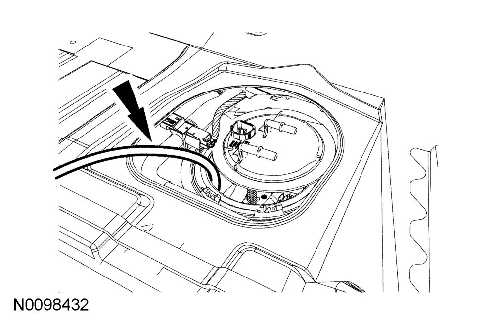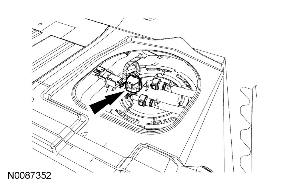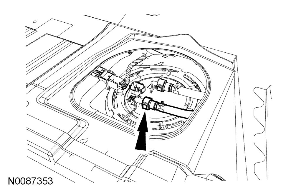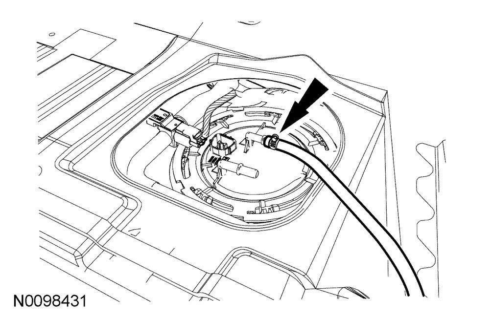 7. Connect the Fuel Storage Tanker to the fuel tank filler pipe recirculation tube port on the FP module and remove approximately one-fourth of the fuel (from a completely full tank), lowering the fuel level below the FP module mounting flange.