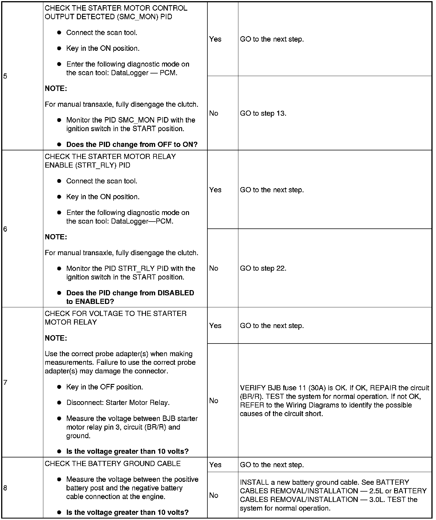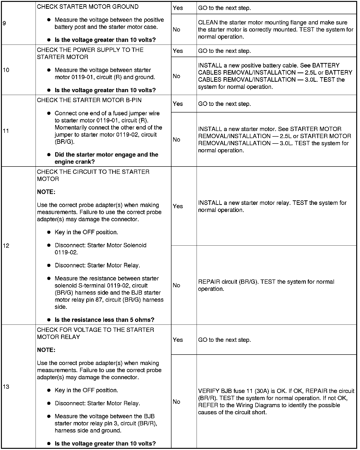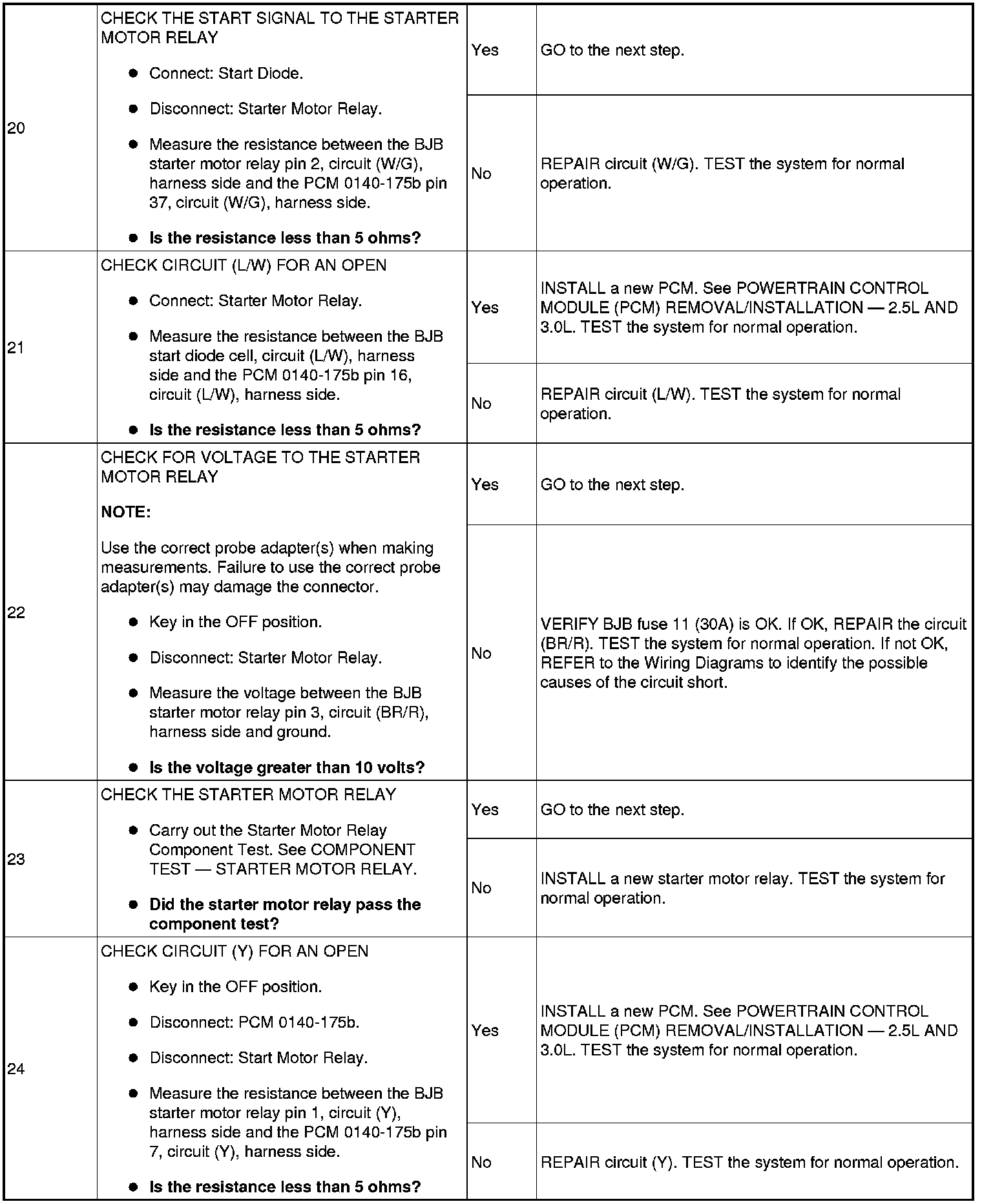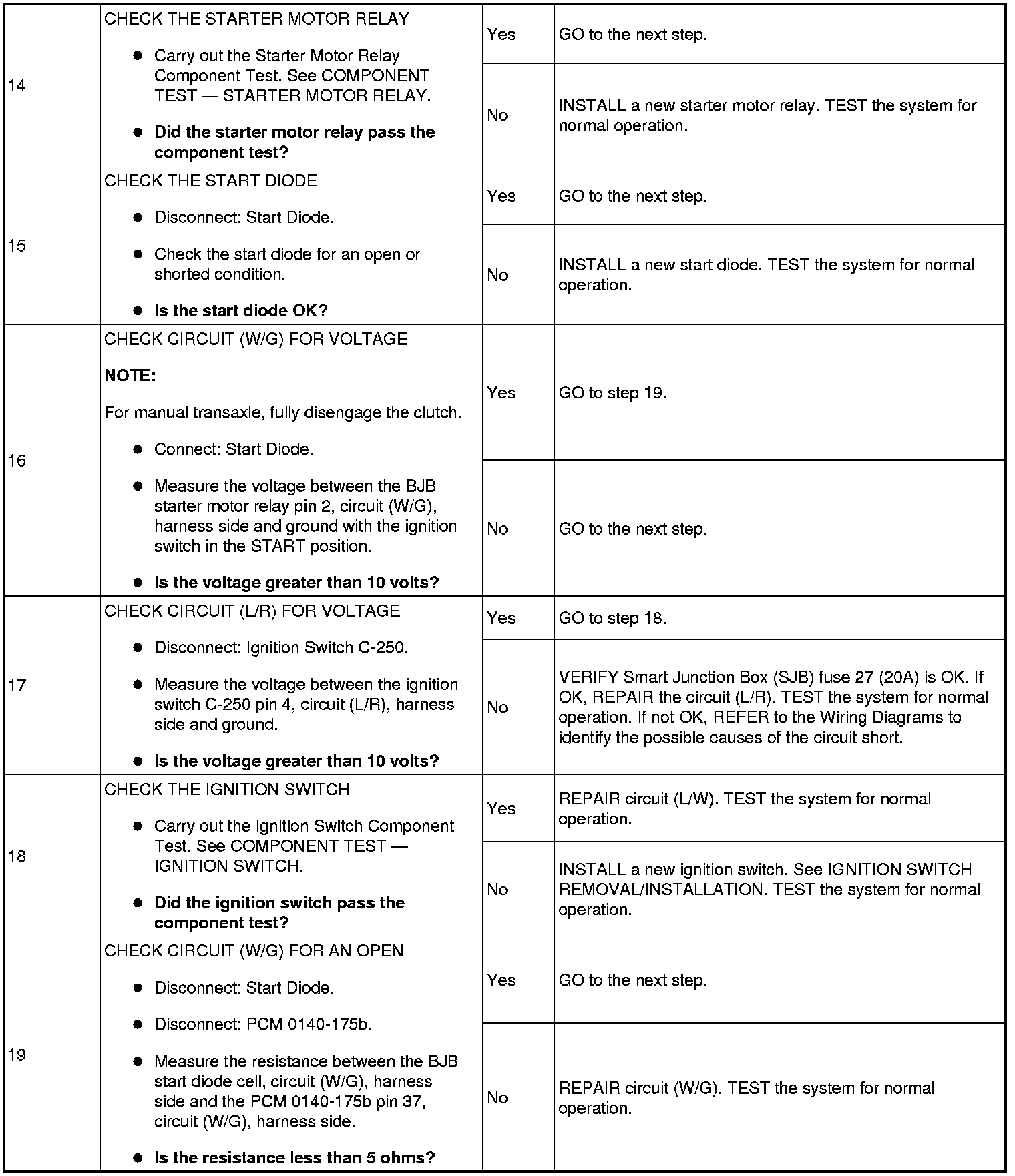 The Battery Junction Box (BJB) supplies constant power to the starter motor relay on circuit (L/R) through fuse 11 (30A). On vehicles with automatic transaxles, when the key is placed in the START position with the vehicle in PARK or NEUTRAL, the Transmission Range (TR) sensor sends a signal to the PCM and provides ground to the starter motor relay. On vehicles with manual transaxles, when the key is placed in the START position with the clutch pedal depressed, the clutch cutoff switch sends a signal to the PCM and provides ground to the starter motor relay. This allows power to be supplied from the starter motor relay contacts which then flows through circuit (BR/G) to the starter solenoid. The solenoid is grounded at the starter motor. Energizing the starter solenoid will engage the starter drive into the ring gear and closes the solenoid contacts, allowing power directly from the battery through circuit (R) to the starter motor to start the engine.