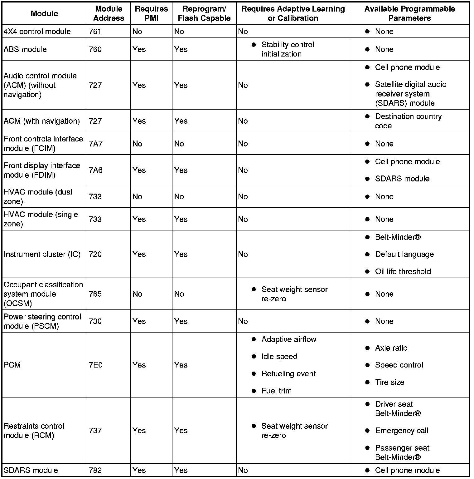 Module Configuration and Parameter Chart
