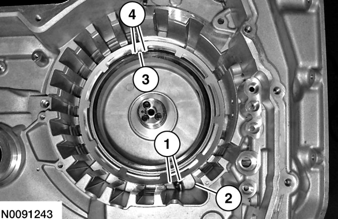 CAUTION:Be sure the snap ring is aligned with the gap facing the front of the transaxle or damage to the transaxle can occur. The front of the transaxle is where the low/reverse and forward (1, 2, 3, 4) clutch hydraulic ports are located.