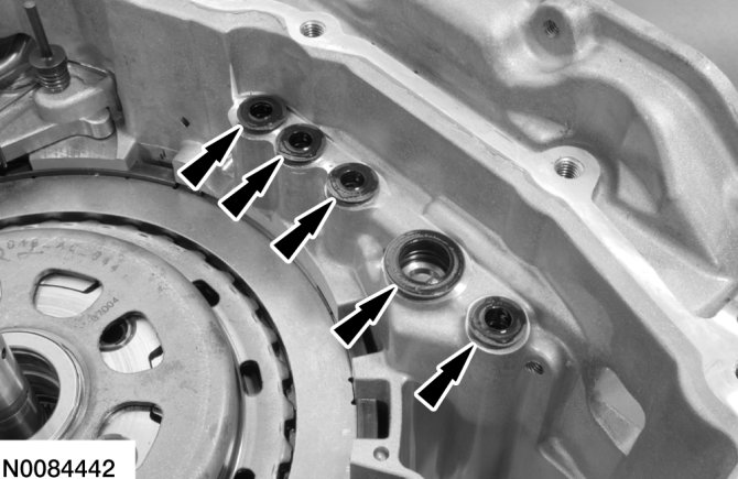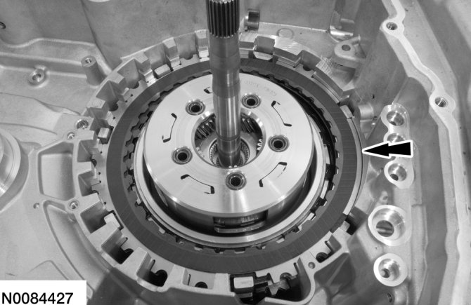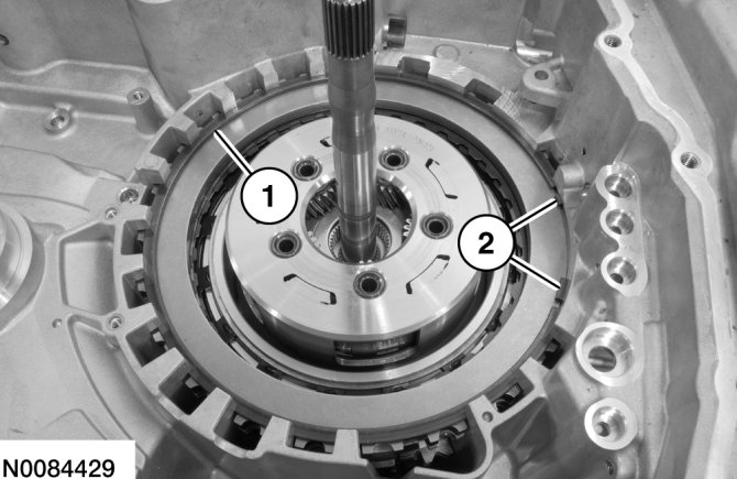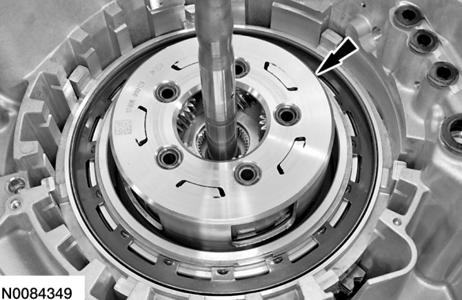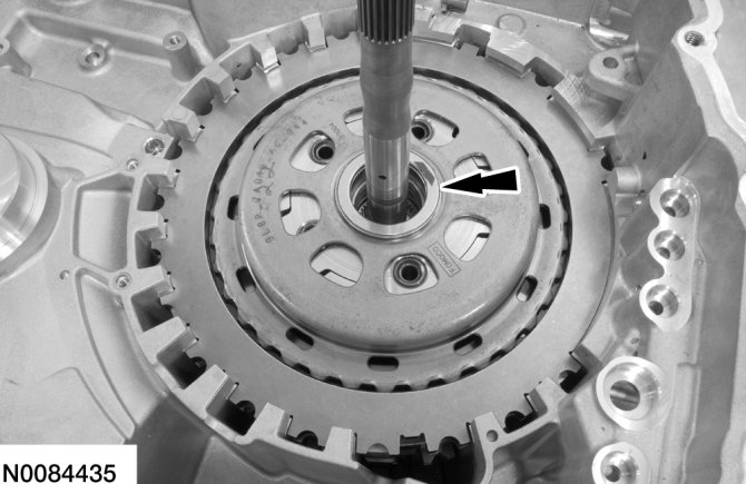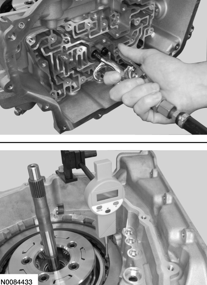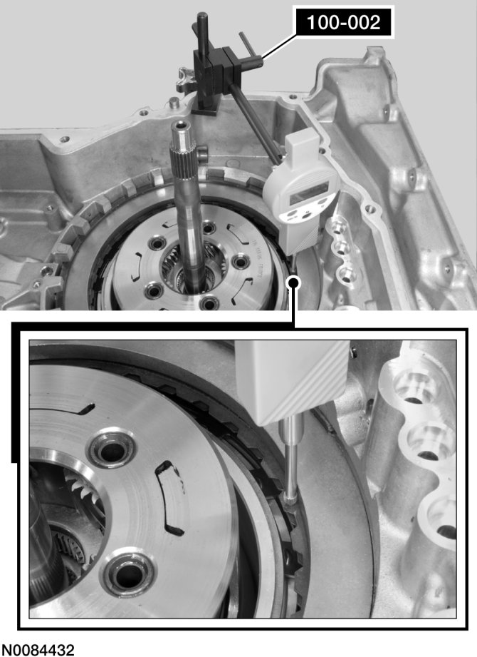 65. Apply 483 kPa (70 psi) of air pressure to the forward (1, 2, 3, 4) clutch piston port while recording the clutch pack clearance on the dial indicator. The clearance should be between 0.076 mm (0.0039 in) and 1.840 mm (0.0724 in). If the clearance is out of range, check the forward (1, 2, 3, 4) clutch pack for correct installation and the transaxle for correct assembly. If the forward (1, 2, 3, 4) clutch pack is correctly installed, install a new forward (1, 2, 3, 4) clutch pack.