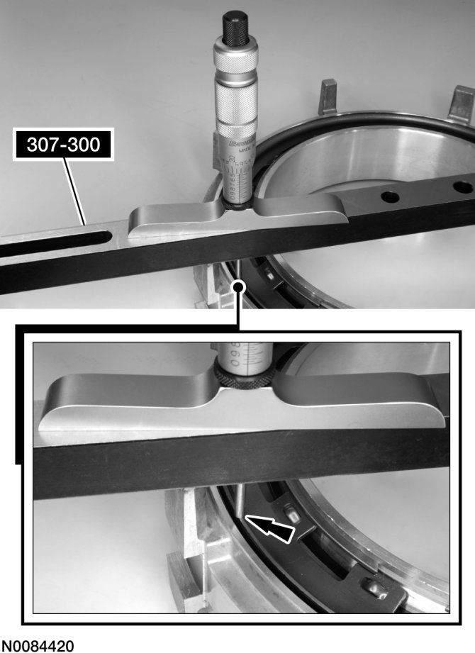 43. Using a suitable depth gauge, measure and record as measurement B, the distance from the top of Shim Selection Gauge 307-300 to the leg surface of the center support.