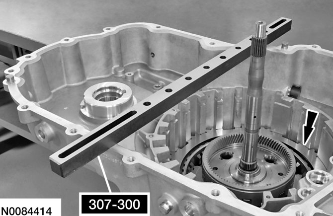 47. Using a suitable depth gauge, measure and record as measurement E, the distance from the top of Shim Selection Gauge to the top of the low/reverse clutch at 3 different points and average the 3 distances.