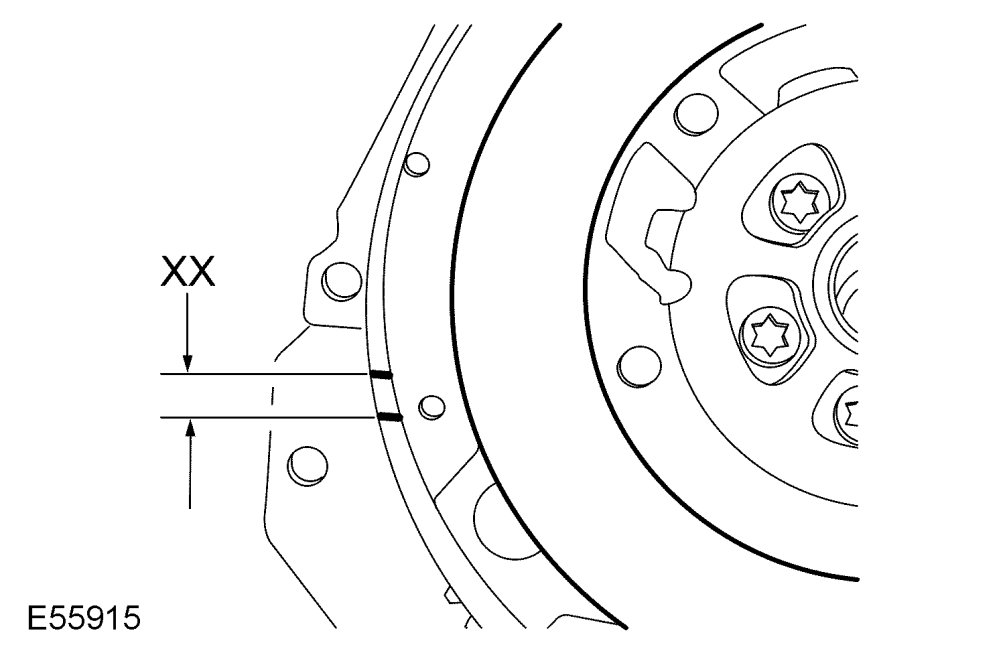 17. Measure the rotational freeplay XX between the 2 reference marks on the primary mass of the dual mass flywheel. If the rotational freeplay exceeds 19 mm (0.750 in), install a new dual mass flywheel.
