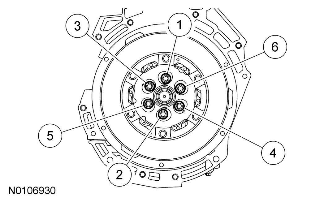 30. Tighten the dual mass flywheel retaining bolts in the sequence shown in 3 stages.