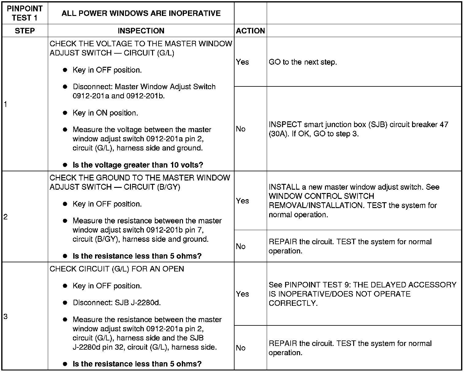 Pinpoint Test 1: All Power Windows Are Inoperative