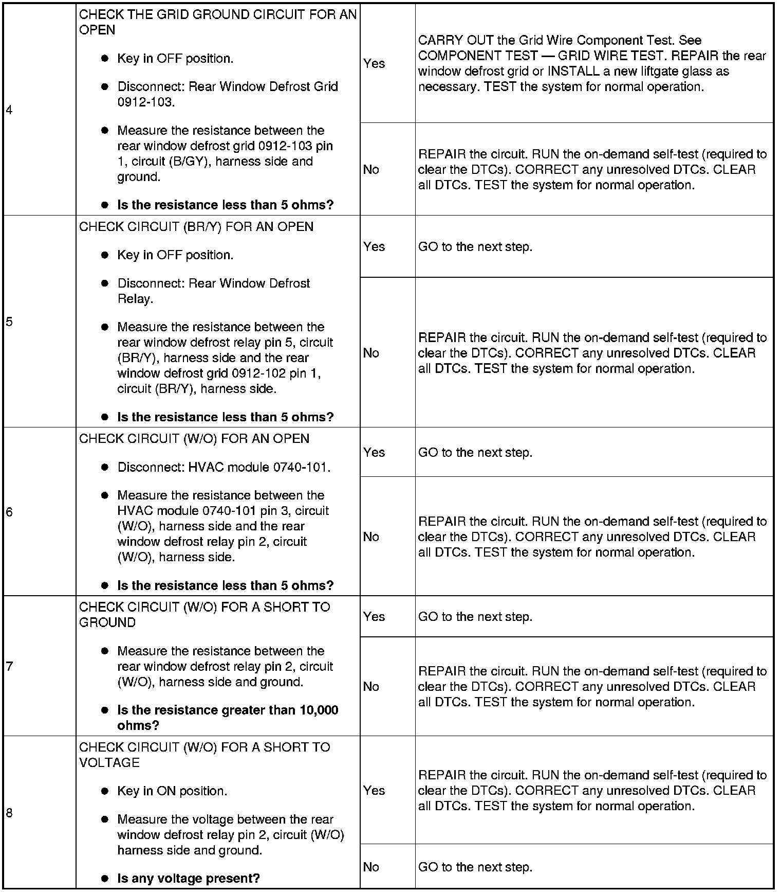The rear window defrost relay receives power from the battery junction box (BJB) fuse 35 (10A) on circuit (Y/GY). When the rear window defrost switch is pressed to the ON position, the HVAC module activates the rear window defrost relay, which then supplies 12 volts to the rear window defrost grid on circuit (BR/Y). The rear window defrost grid is grounded through circuit (B/GY).