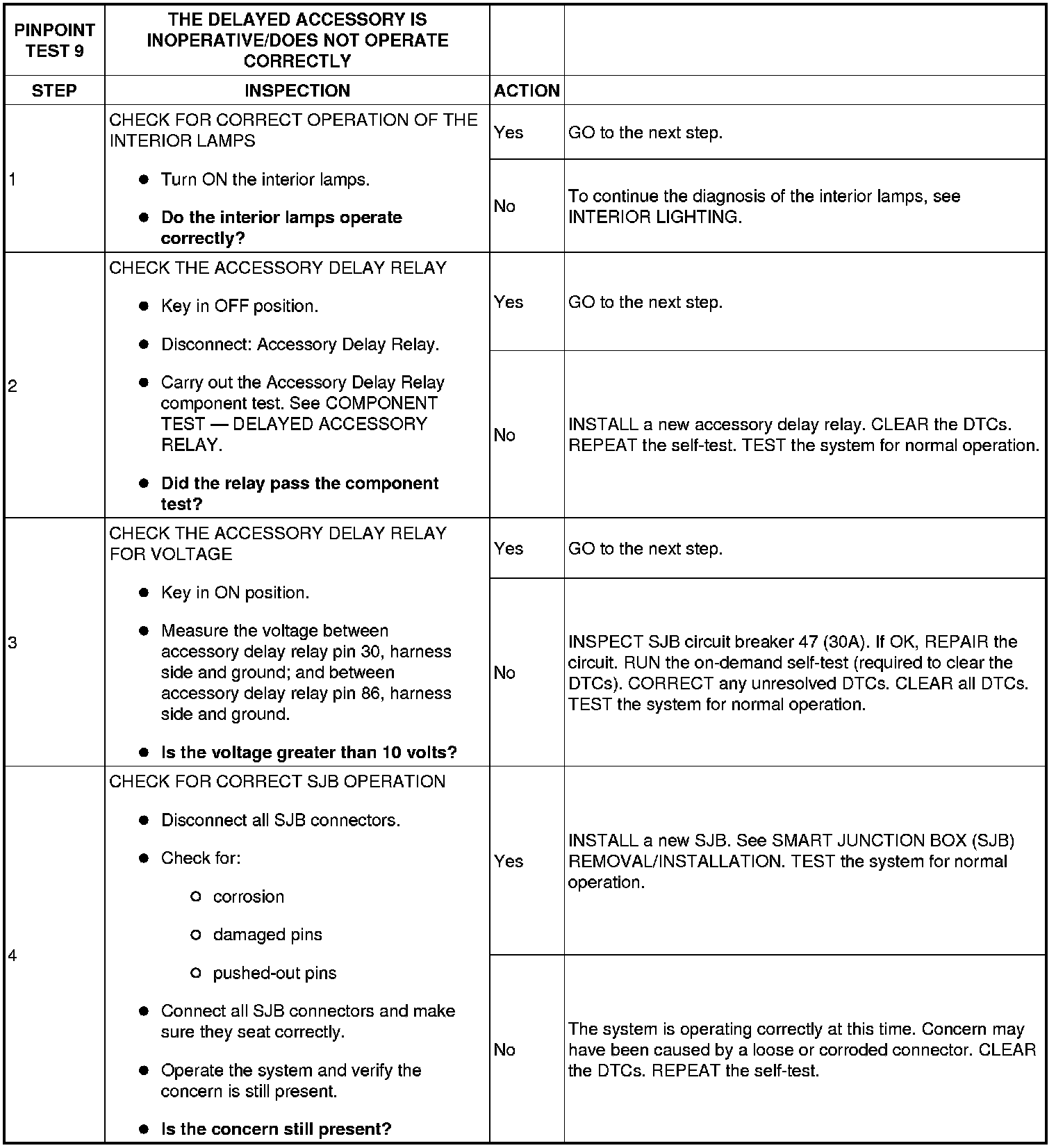Pinpoint Test 9: The Delayed Accessory Is Inoperative/Does Not Operate Correctly