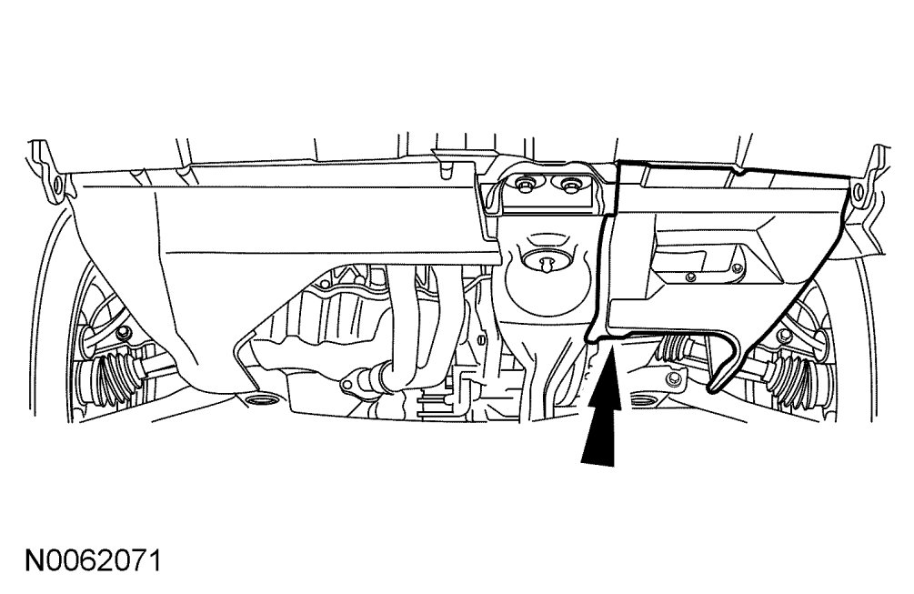 9. Remove the 6 bolts and the scrivet from the LH splash shield and remove the splash shield.