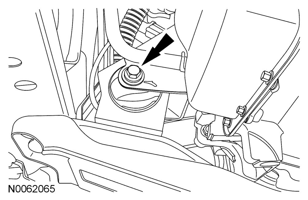 13. Remove the nut and the engine support crossmember. Discard the nut.