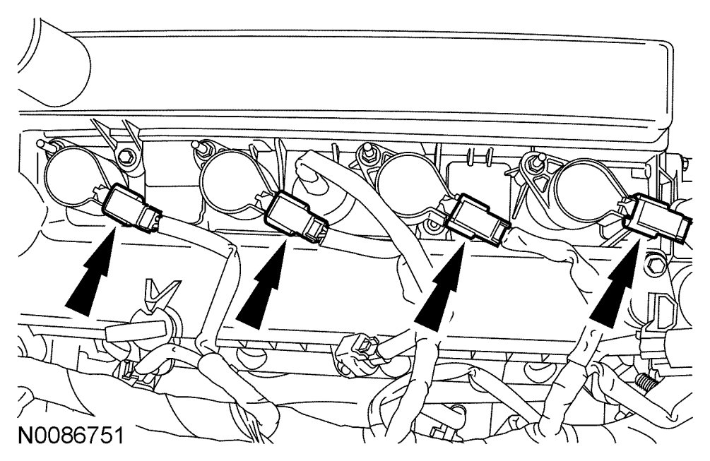 117. Connect the 4 fuel injector electrical connectors, radio capacitor electrical connector and the Camshaft Position (CMP) sensor electrical connector.