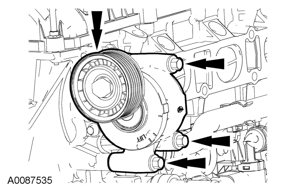 105. Install the coolant pump pulley and bolts.