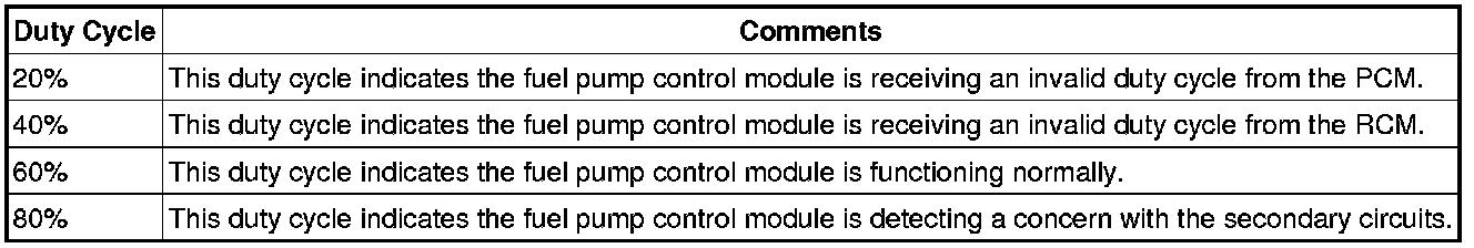The fuel pump control module communicates diagnostic information to the PCM through the FPM circuit. This information is sent by the fuel pump control module as a duty cycle signal. The 4 duty cycle signals that may be sent are listed in the following table. Fuel Pump Driver Module Duty Cycle Signals