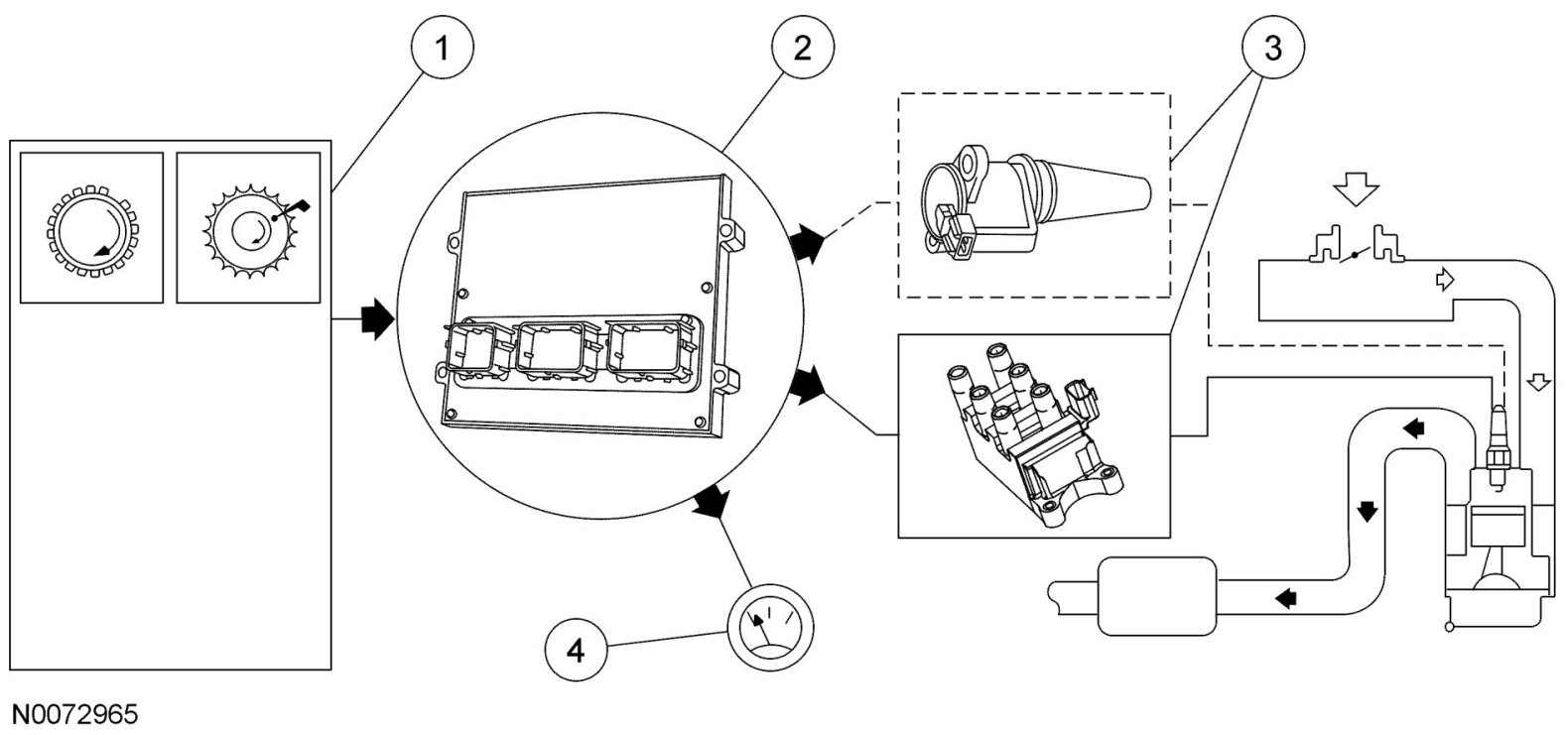 3. The PCM controls the ignition coils after it calculates the spark target. The COP system fires only one spark plug per coil upon synchronization during the compression stroke. For the coil pack ignition system, each coil within a pack fires 2 spark plugs at the same time. The plugs are paired so that as one fires during the compression stroke the other fires during the exhaust stroke. The next time the coil is fired the situation is reversed.The current flow, or dwell, through the primary ignition coil is controlled by the PCM by providing a switched ground path through the ignition coil driver to ground. When the ignition coil driver is switched on, current rapidly builds up to a maximum value, determined by the coil inductance and resistance. When the current is switched off, the magnetic field collapses which induces a secondary high-voltage surge and the spark plug is fired. This high-voltage surge creates a flyback voltage which the PCM uses as a feedback during the ignition diagnostics. The PCM uses the charge current dwell time characteristics to carry out the ignition diagnostics.