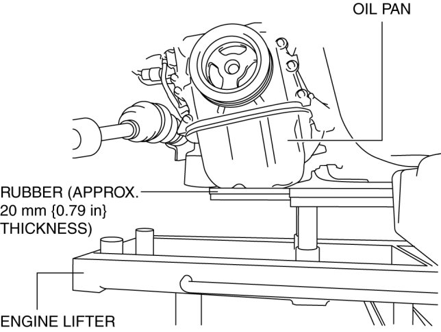 - When using an engine lifter, insert rubber of appropriate size (approx. 20 mm {0.79 in} thickness) between the engine lifter and the oil pan to support the oil pan.