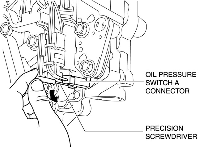 9. Insert a precision screwdriver and move it in the direction of the arrow to disconnect the oil pressure switch A connector as shown in the figure.