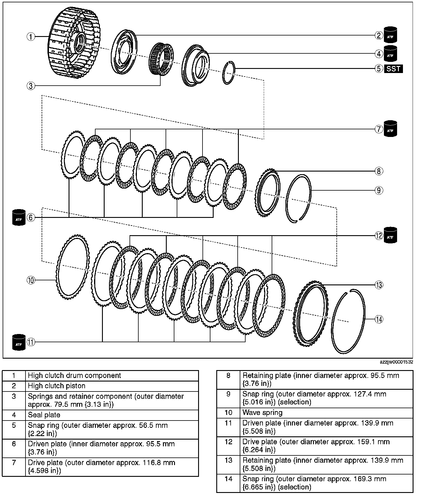 CAUTION: If the drive plate is replaced with a new one, immerse it in ATF (ATF FZ) for 2 hours or more to permeate the facing with ATF.
