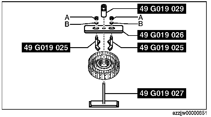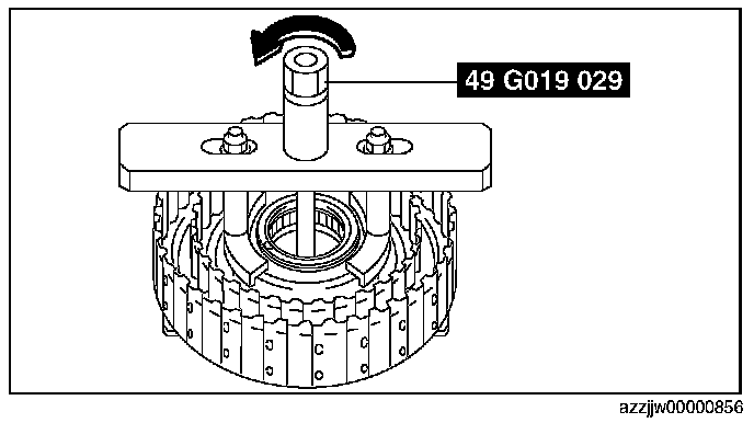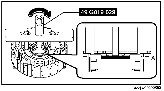 CAUTION: If the SST (49 G019 029) is tightened with excessive force, surrounding parts could be damaged. Stop tightening the SST when the snap ring groove of the high clutch drum component comes out.