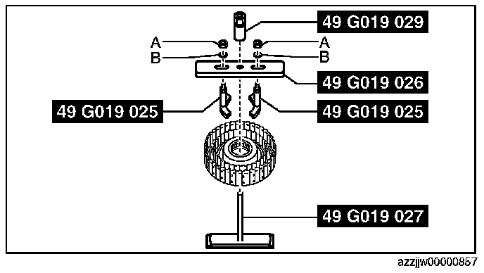 3. Tighten the SST (49 G019 029) until the snap ring groove of the high clutch drum component comes out.