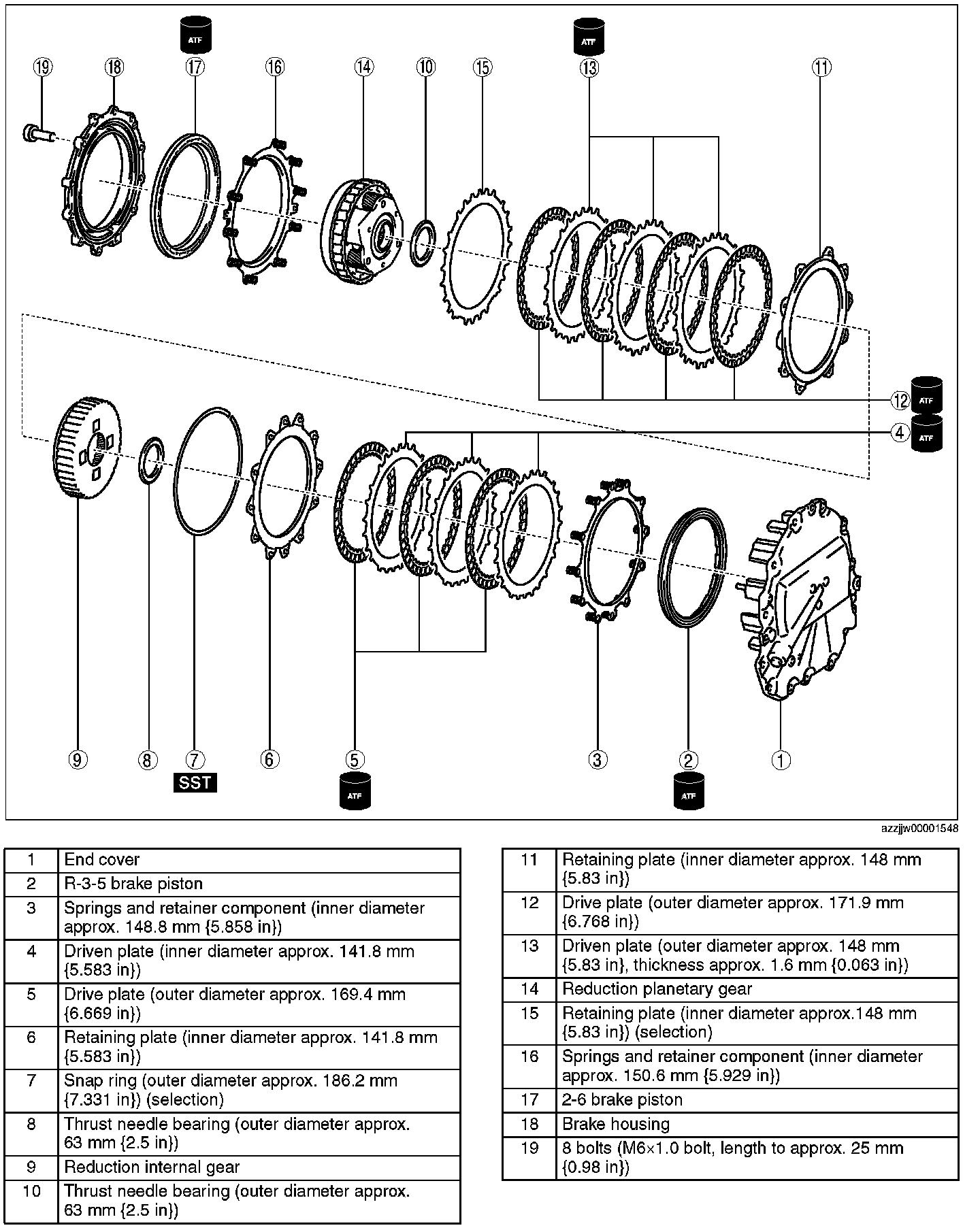 CAUTION: If the drive plate is replaced with a new one, immerse it in ATF (ATF FZ) for 2 hours or more to permeate the facing with ATF.