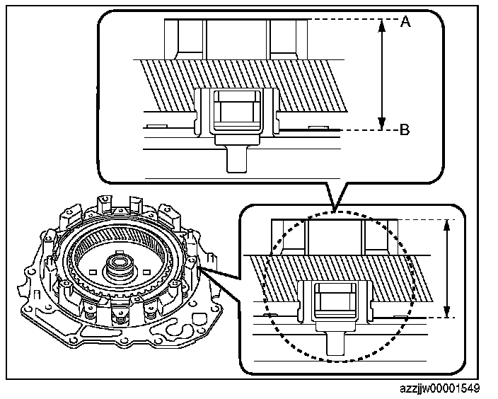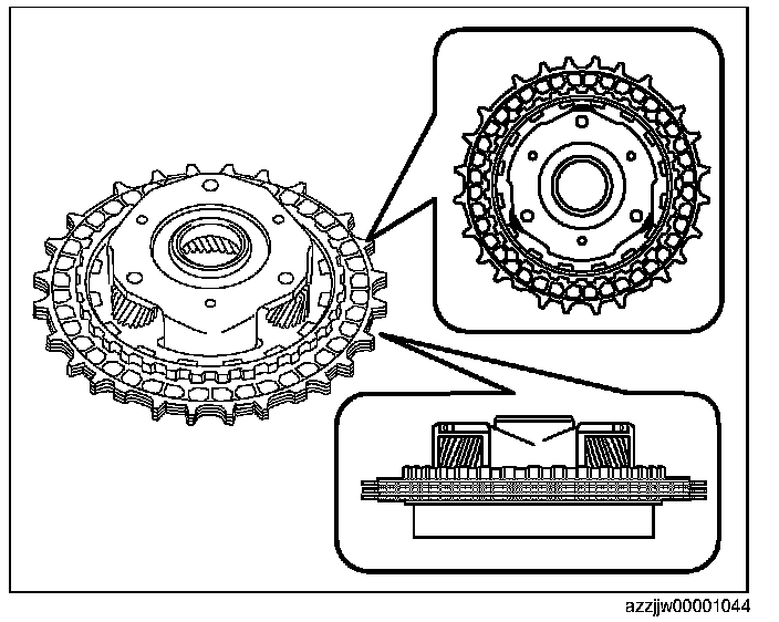 - Assemble the retaining plate so that the splines of the retaining plate and the splines of the driven plates are positioned as shown in the figure.