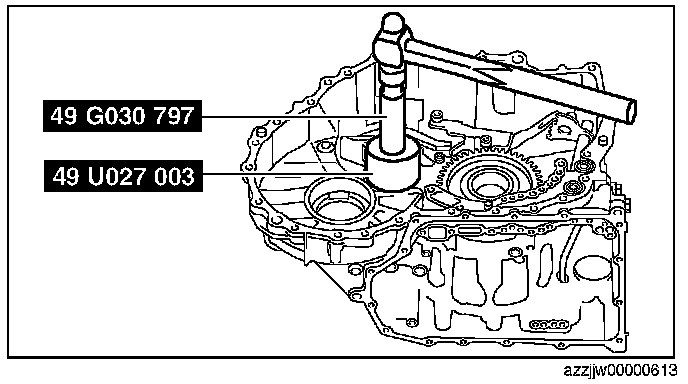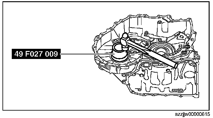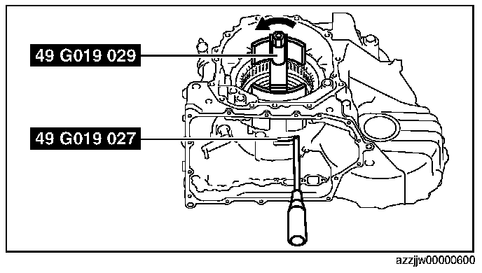 CAUTION: If the SST (49 G019 029) is tightened with excessive force, surrounding parts could be damaged. Stop tightening the SST when the snap ring groove of the transaxle case comes out.