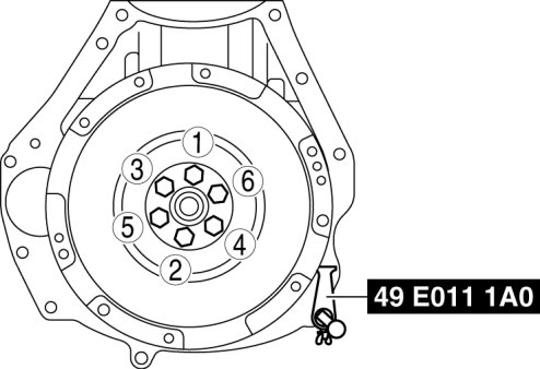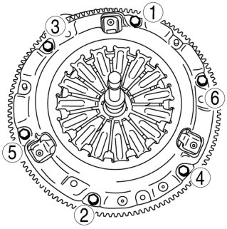 b. Tighten the bolts completely in the order shown in the figure and install the clutch disc and cover.