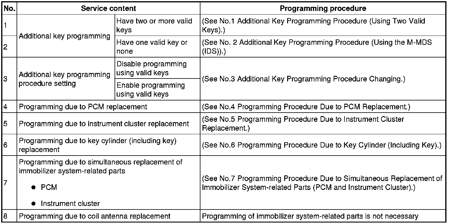 Immobilizer System-Related Parts Service and Programming Procedure Table