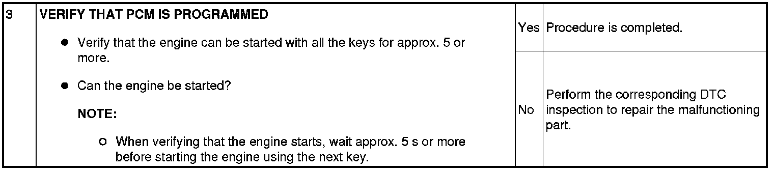 - If the engine is started during immobilizer system-related parts programming, the programming mode cancels. Therefore, do not start the engine unless indicated in the procedure. Repeat the procedure from the beginning if the engine is started during the immobilizer system-related parts programming.
