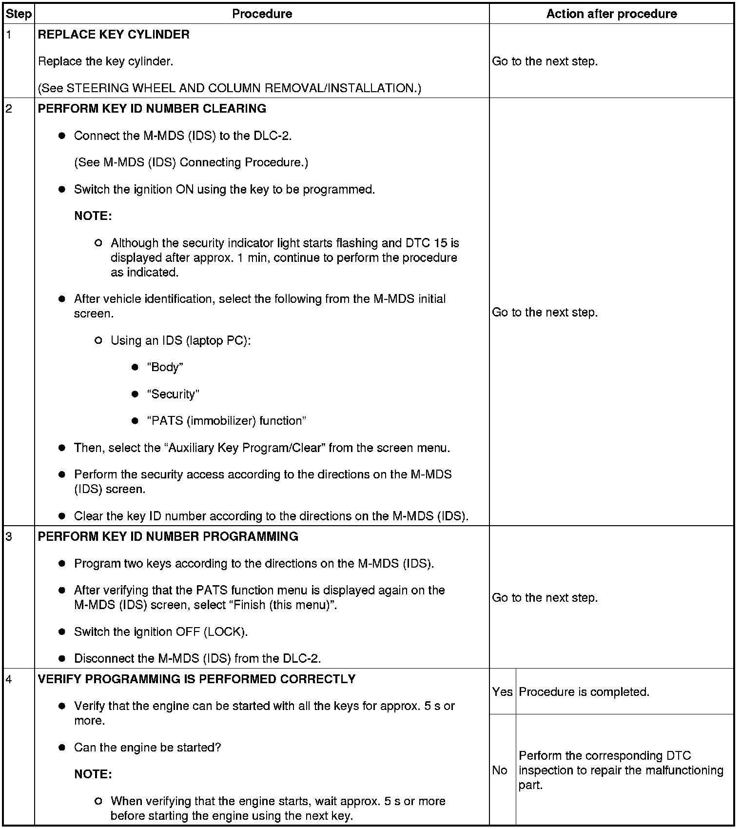 - If a key ID number cannot be programmed and DTC 15 is displayed, the maximum number of programmable keys may have been exceeded. Verify the number of programmed keys using the M-MDS (IDS).