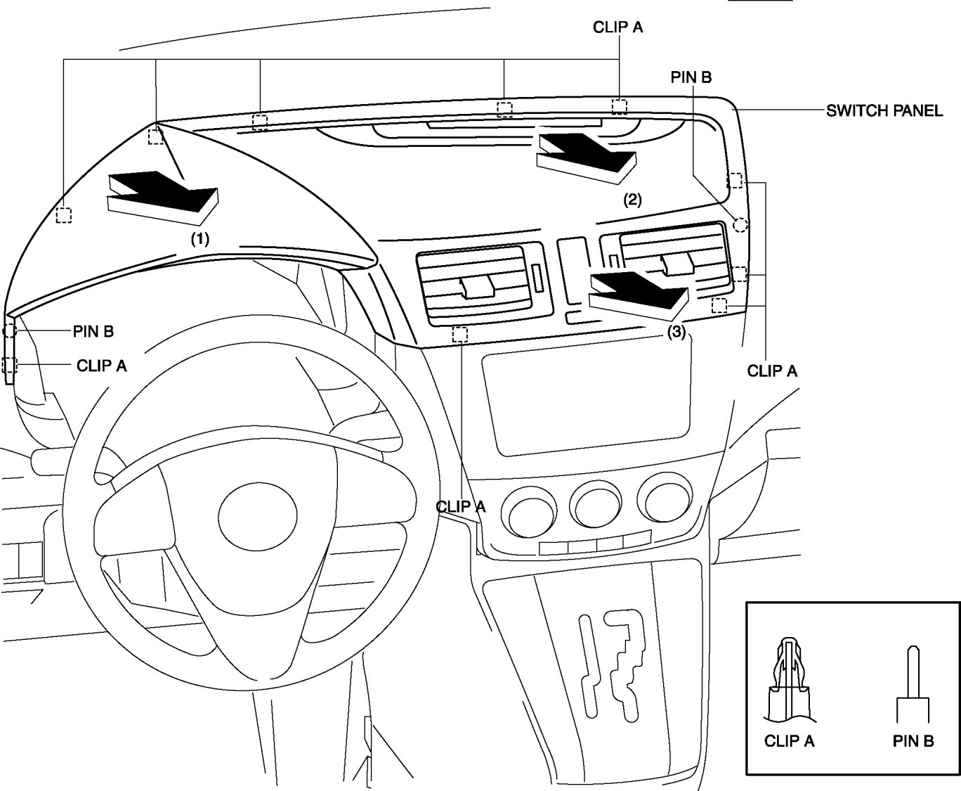 4. Pull the switch panel in the direction of the arrow in the order of (1), (2), (3) and remove the switch panel while detaching the clips A and pins B.