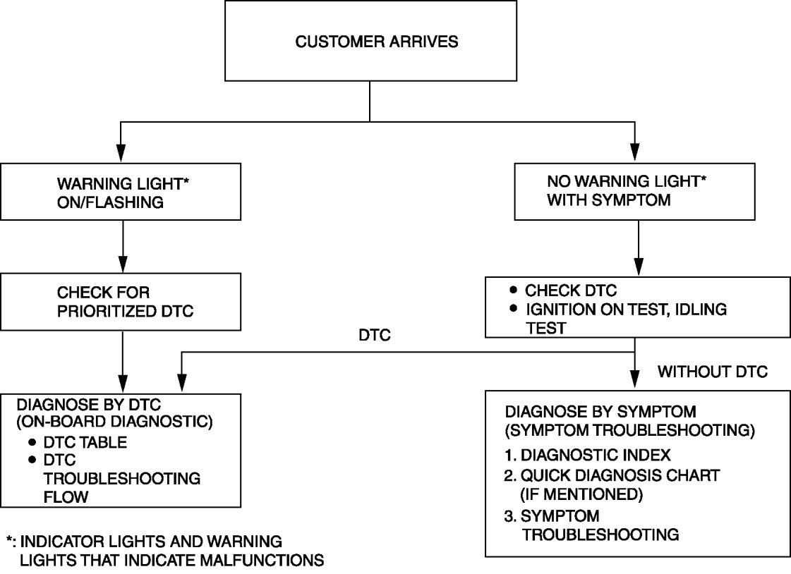 - The quick diagnosis chart lists diagnosis and inspection procedures to be performed specifically relating to the cause of the malfunction.