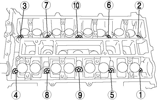 1. Loosen the cylinder head bolts in 2-3 steps in the order shown in the figure.