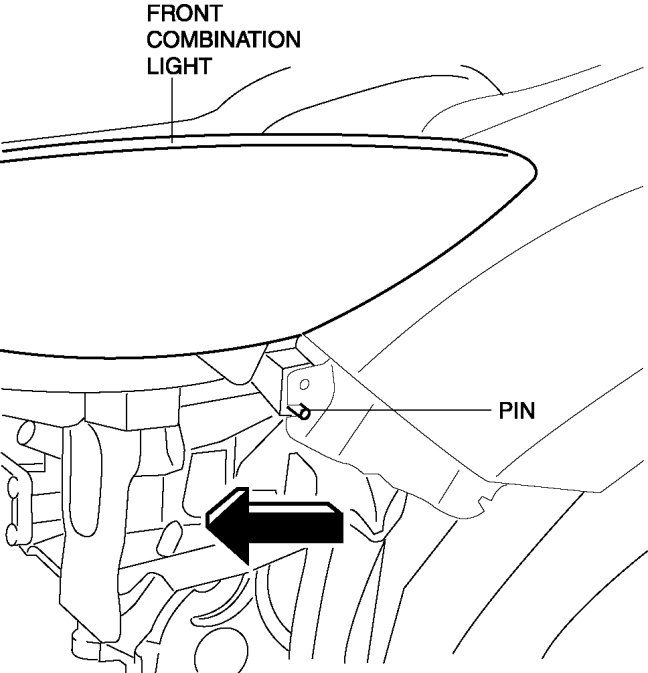6. Pull the front combination light in the direction of the arrow shown in the figure and remove the pin from the body.