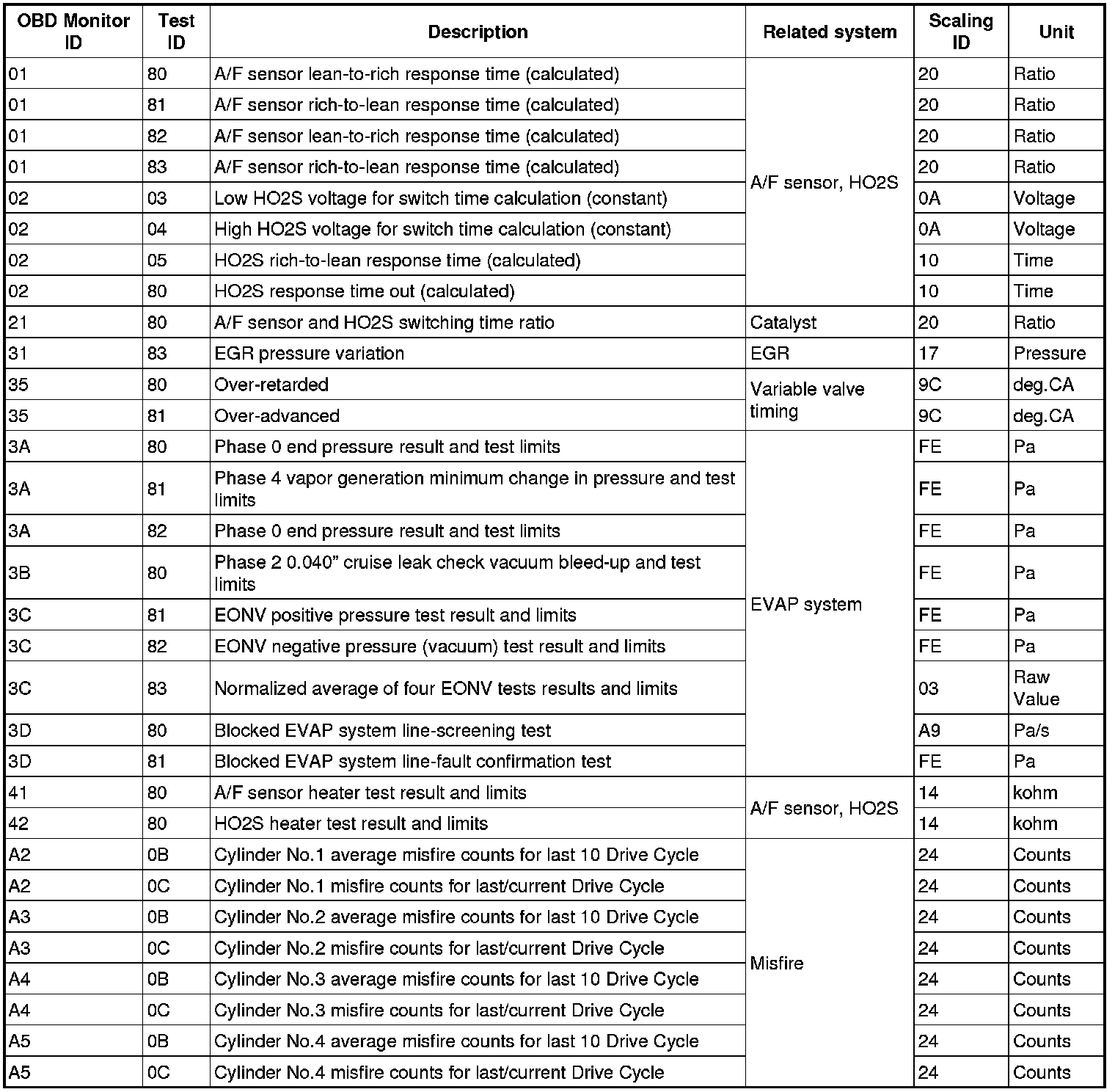 The purpose of this test mode is to confirm the result of OBD-II monitor diagnostic test results. The result values stored when particular monitor is completed are displayed. If the monitor is not completed, initial value is displayed.