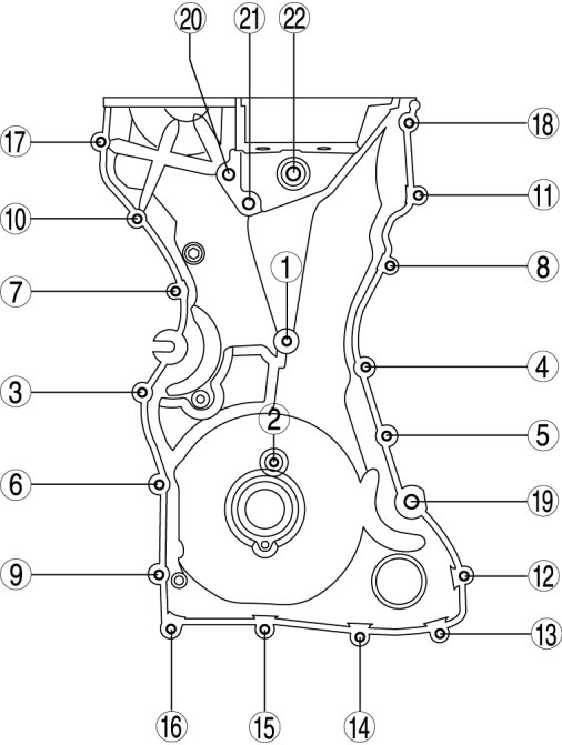 Timing CoverInstall the engine front cover bolts in the order as shown.