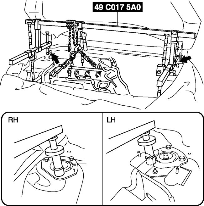 e. As shown in the figure, set the rear shafts of the SST to the left and right shock absorber upper bolts.