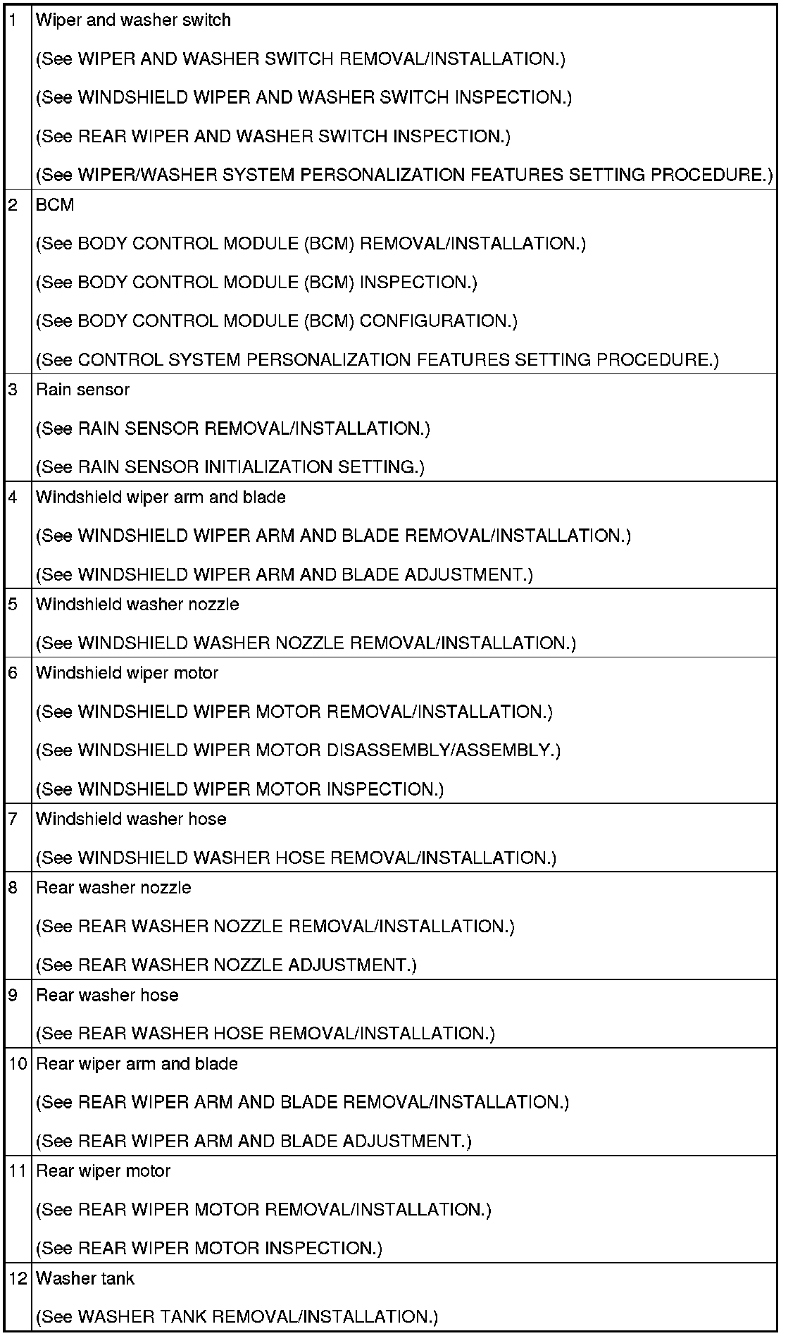 WIPER/WASHER SYSTEM LOCATION INDEX