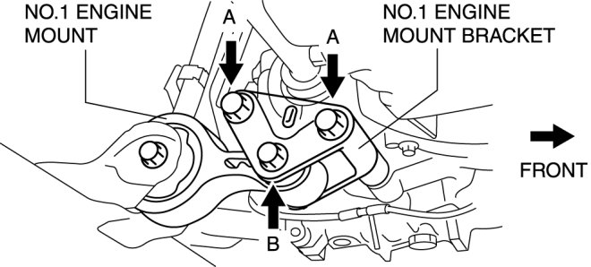 4. Loosen the No.1 engine mount bolts A, and remove the No.1 engine mount bolt B.