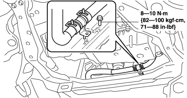 7. Install the radiator hose bracket to the front crossmember.