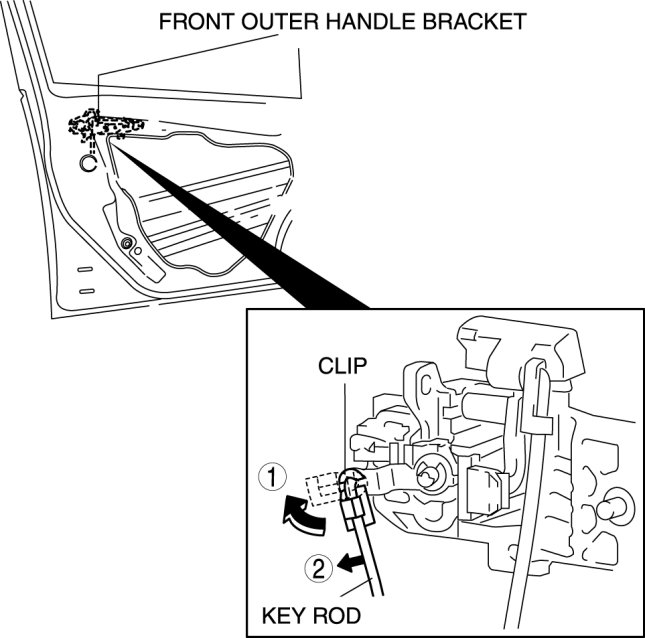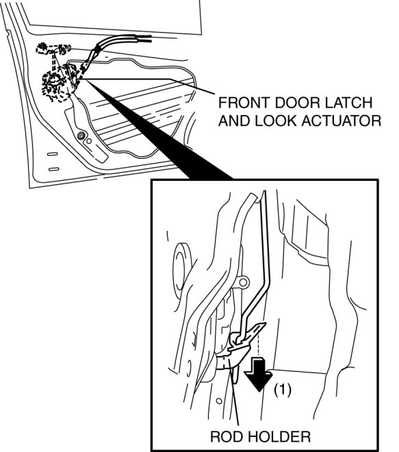 7. Press down the rod holder of the front door latch and lock actuator in the direction of the arrow.