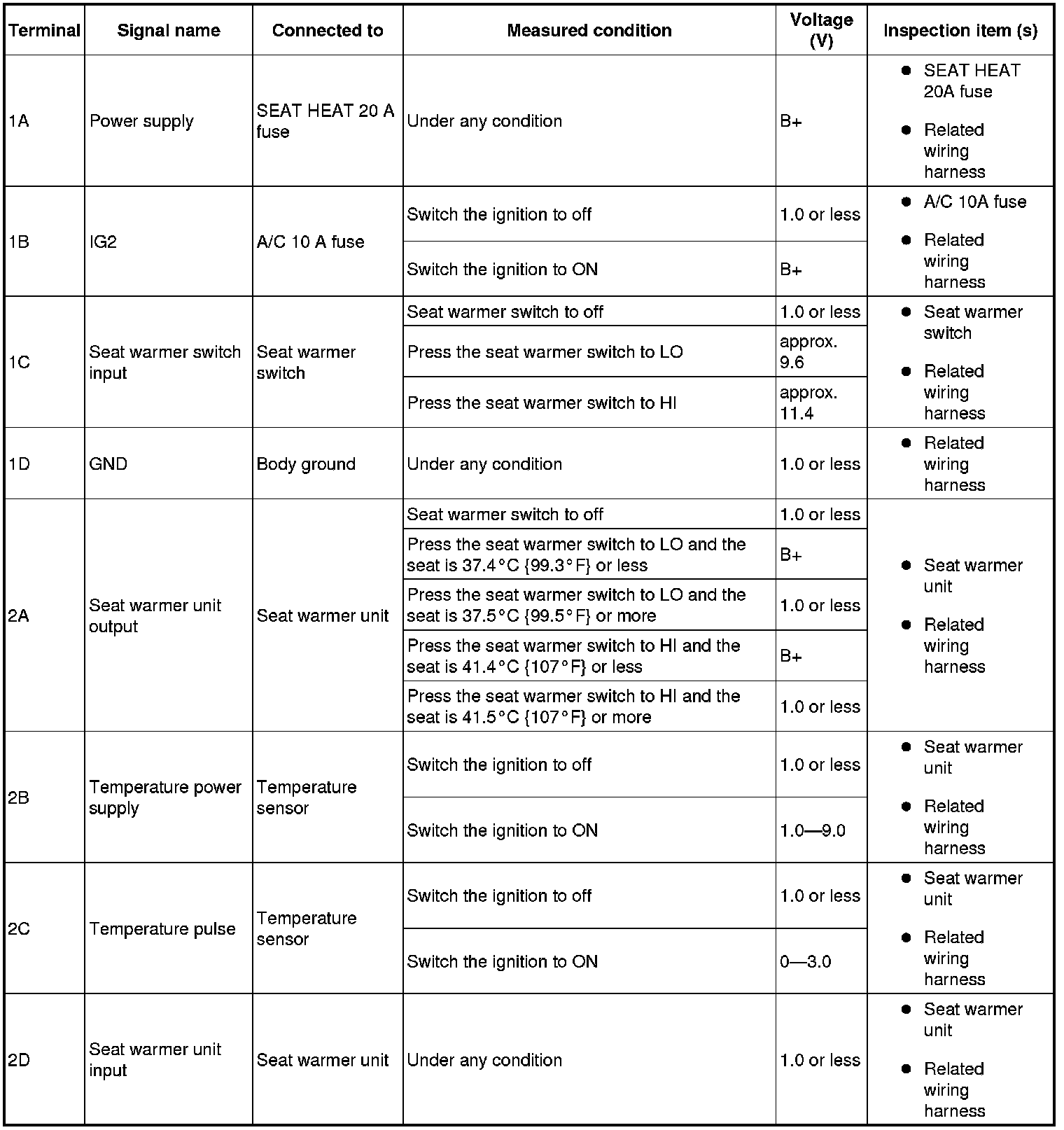 - If the voltage is not as specified in the Terminal Voltage Table (Reference), inspect the parts under " Inspection item (s)" and related wiring harnesses.