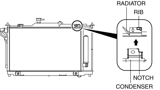 2. Align the bracket notch of the condenser to the radiator positioning rib.