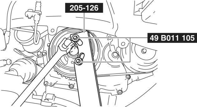 3. To position the crankshaft pulley, temporarily tighten it and, using a suitable bolt (M6 X 1.0), fix the crankshaft pulley to the engine front cover.