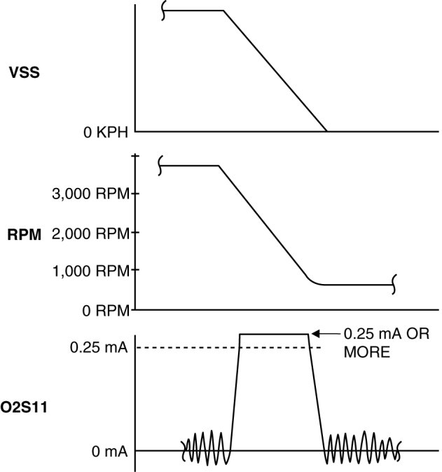 4. Verify that the A/F sensor current (PID: O2S11) is 0.25 mA or more while decelerating as shown in the figure.