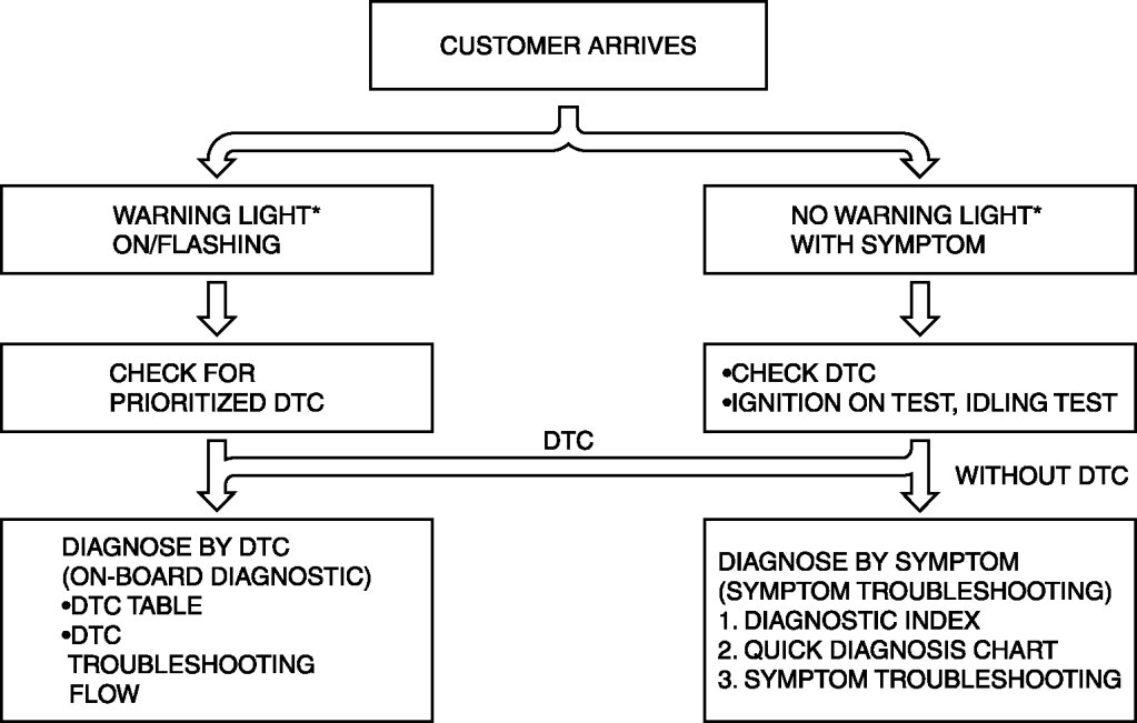 - When the customer reports a vehicle malfunction, check the malfunction indicator lamp (MIL) indication and diagnostic trouble code (DTC), then diagnose the malfunction according to the following flowchart: