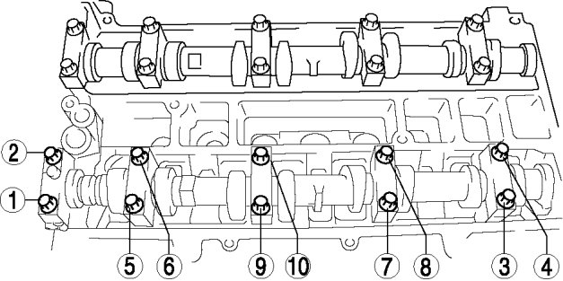 22. Loosen the camshaft cap bolts in two or three steps in the order shown in the figure and remove the camshaft cap.