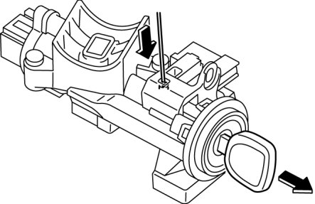 2. Insert a pin from the position indicated by the arrow in the figure, and while pressing the lock lever with the pin, remove the key cylinder from the steering lock.
