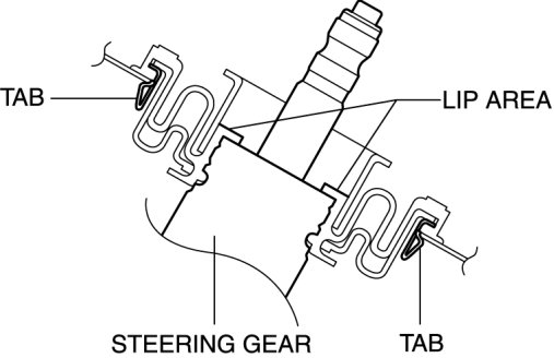 2. Verify that the lip area of the steering dust cover is securely installed to the steering gear, and the tabs are installed to the dashboard lower panel.