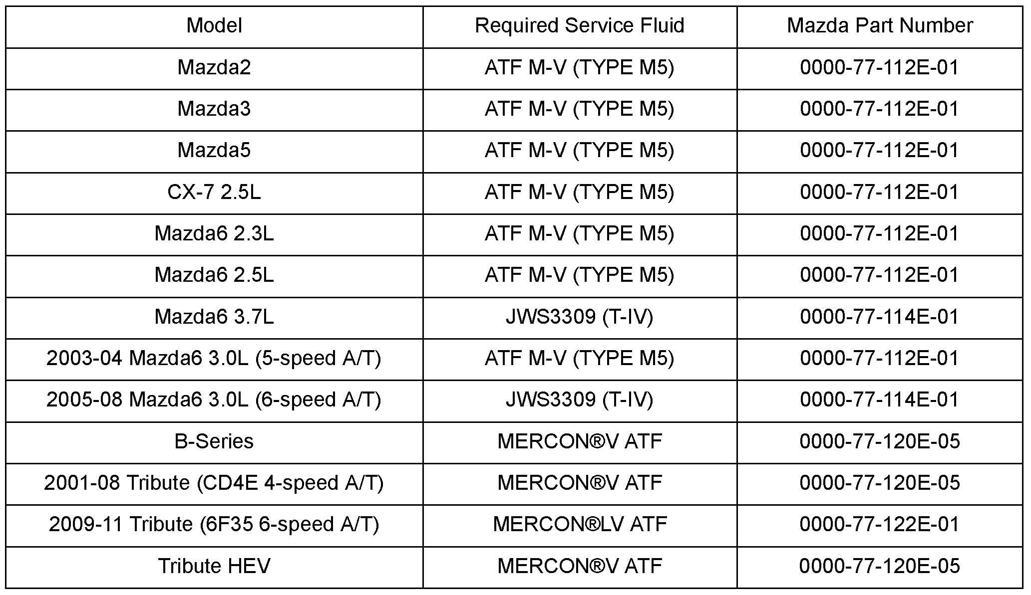 Refer to the following table to determine the correct automatic transmission fluid.